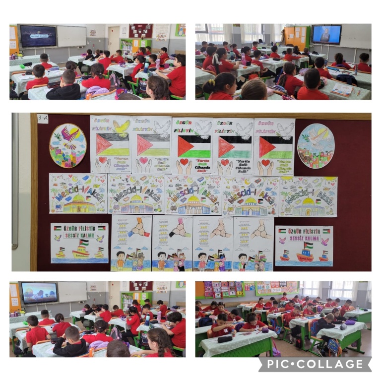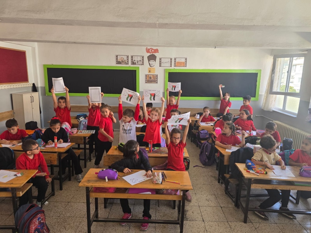 Etkinlikler çerçevesinde sınıflarımızda öğrencilerimize Filistin’de yaşanan insani krizle ilgili farkındalıklarını artırmaya yönelik sunumlar izletildi. Öğrenciler, izledikleri içeriklerin ardından konuyla ilgili düşüncelerini paylaşarak empati kurmaya teşvik edildi. Ardından öğrencilerimiz barış ve dayanışma temalı boyama çalışmalarıyla duygularını renklerle ifade etme fırsatı buldu. Hazırlanan bu çalışmalar sınıf panolarında sergilenerek okul genelinde güçlü bir görsel farkındalık ortamı oluşturuldu.